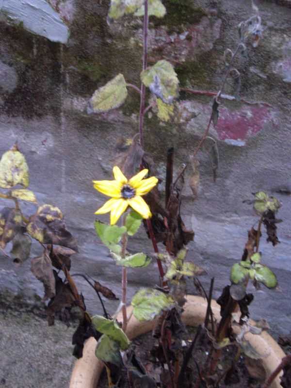 I sommer såede jeg nogle mini-solsikker i et par potter; succesen var moderat, men om ikke andet er de stædige! I dag, 2.december, er den sidste solsikke i gang med at solsikke af alle kræfter - våd, ensom og meget forkommen - men den er der, og den stråler sit "jeg vidst', jeg ku'!" ind gennem altandøren til os på 4. uge nu.